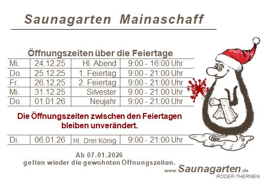 Schauen Sie Sich in Ruhe auf der Website zu unserem Saunagarten in Mainaschaff um, oder springen Sie direkt zu einem Thema, das Sie besonders interessiert.
